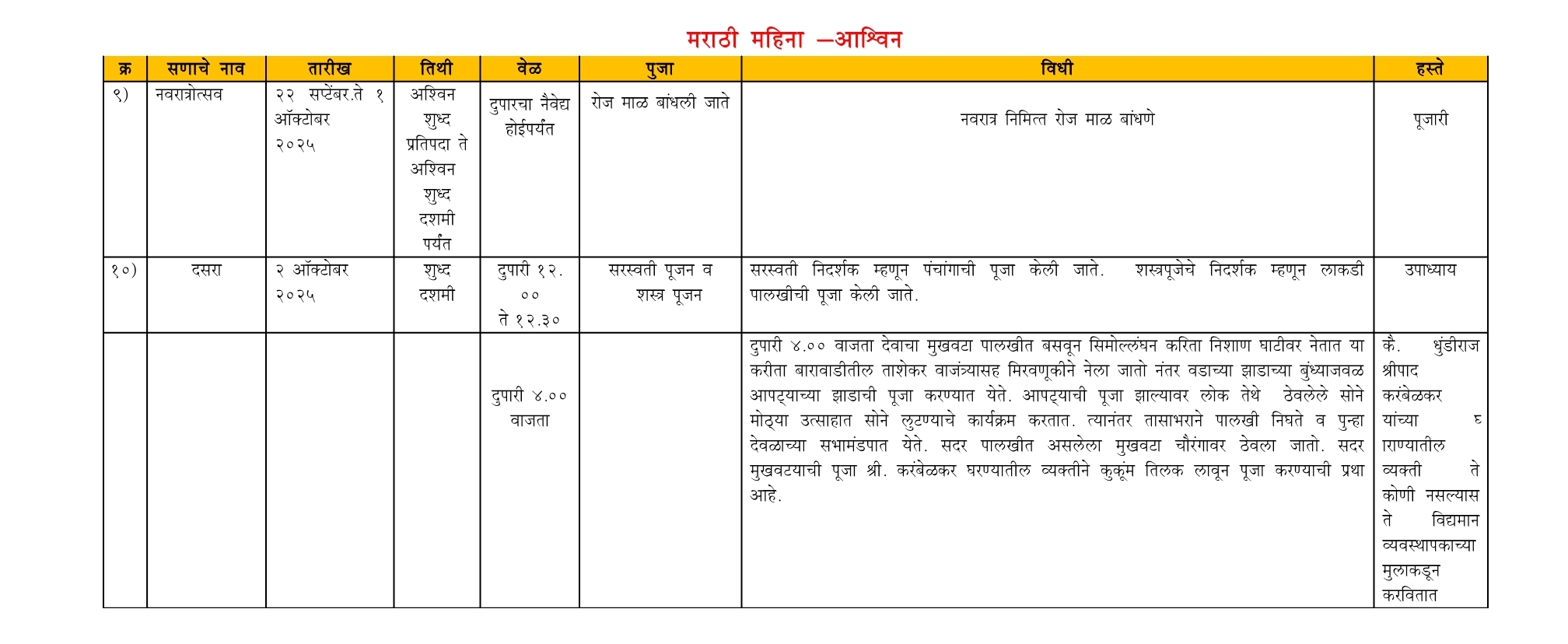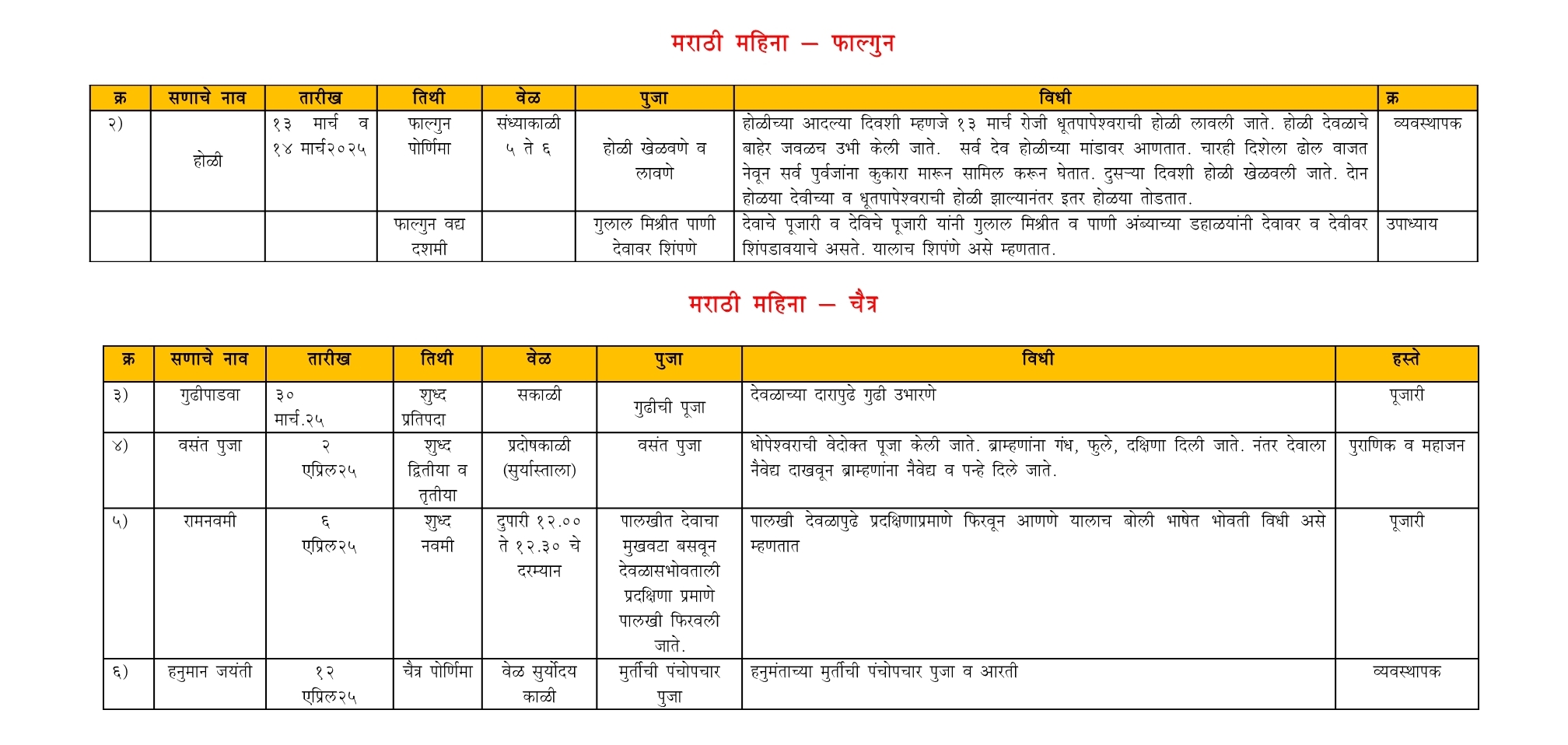 श्री देव देवस्थान धूतपापेश्वर - वार्षिक कार्यक्रम (२०२५)