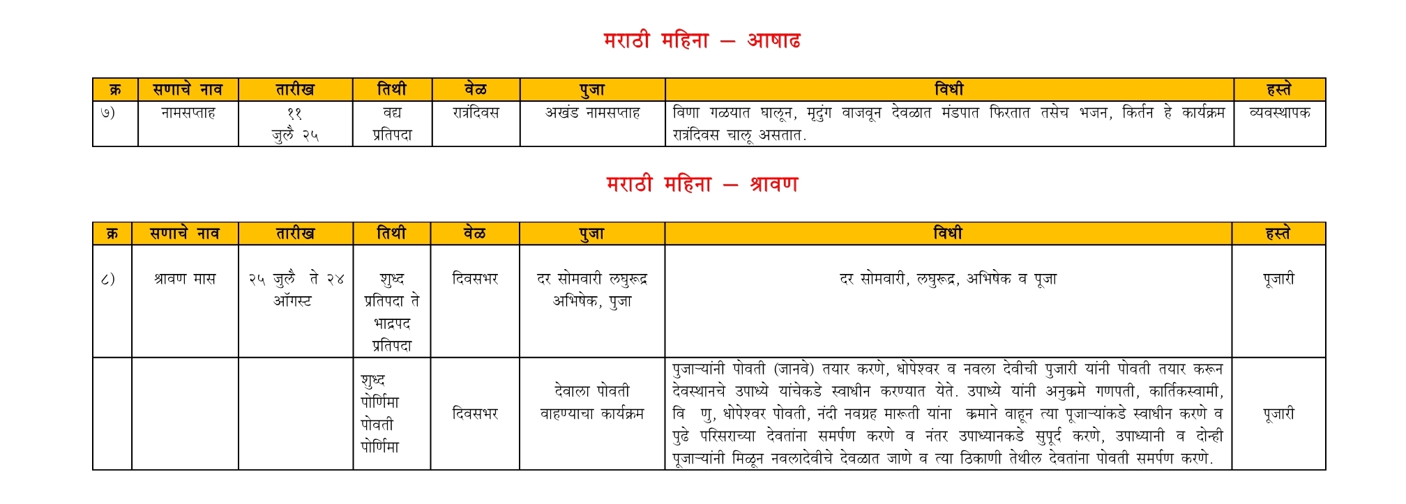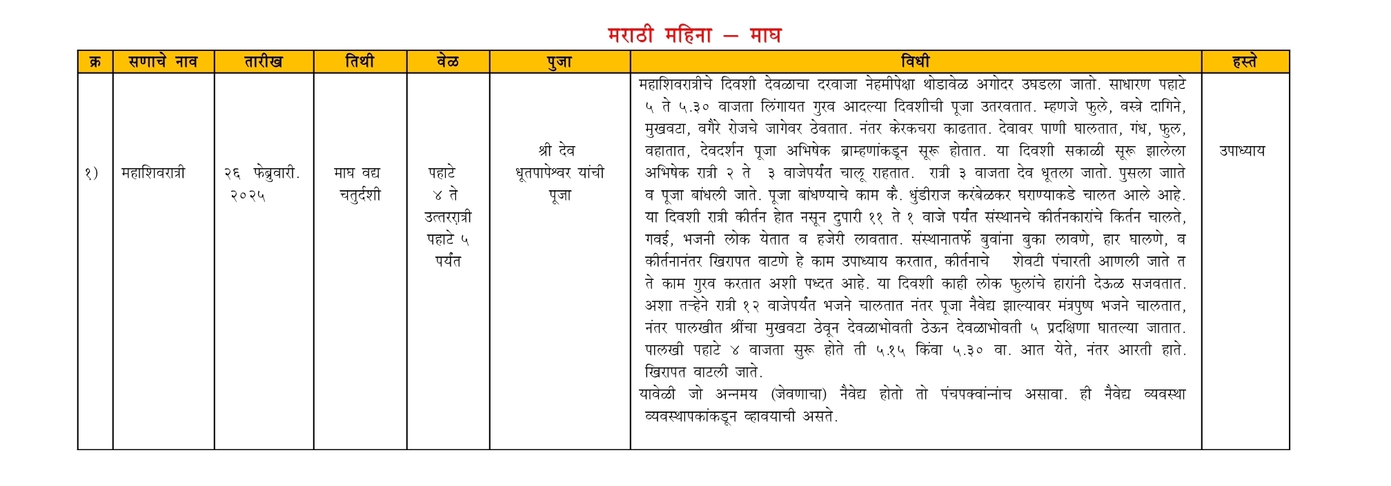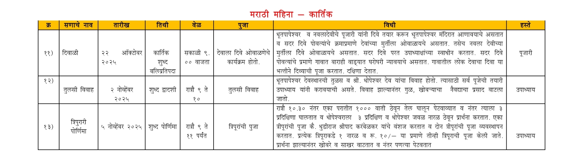 श्री देव देवस्थान धूतपापेश्वर - वार्षिक कार्यक्रम (२०२५)